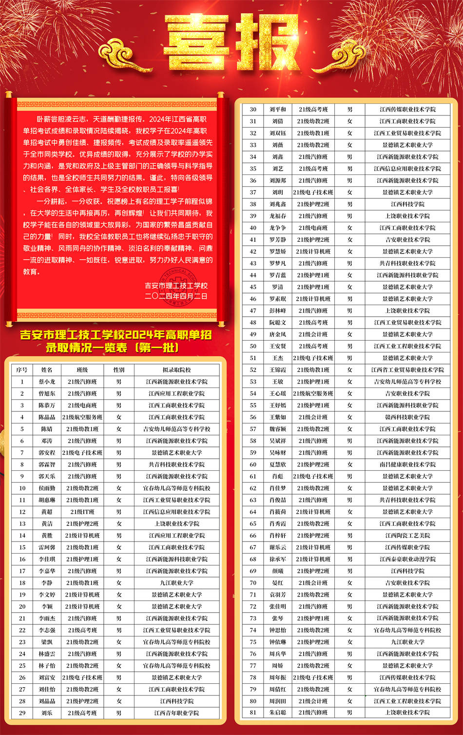 喜報!熱烈祝賀我校2024年江西省高職單招考試勇創(chuàng)佳績