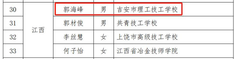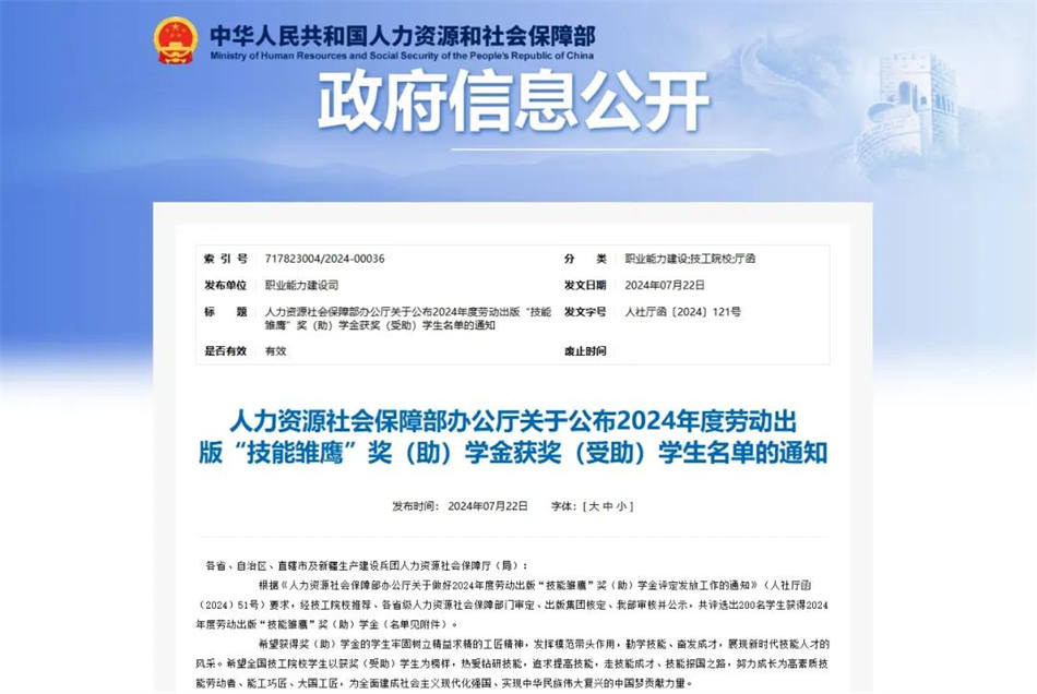 近日,人力資源和社會(huì)保障部辦公廳公布了2024年度勞動(dòng)出版“技能雛鷹”獎(jiǎng)(助)學(xué)金名單,全國共有200名學(xué)生入選,我校22屆汽車維修專業(yè)郭海峰同學(xué)獲此殊榮。