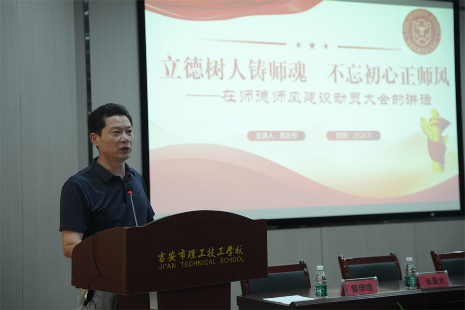 會上,江西宏為教育發(fā)展集團有限公司董事長、吉安市理工技工學校校長賴赴權(quán)作了題為《立德樹人鑄師魂,不忘初心正師風》的講話。賴董事長深情回顧了在學校發(fā)展歷程中,那些以高尚師德為引領(lǐng)、以無私奉獻為動力的感人事跡,并指出:“在新時代的征程上,我們不僅要傳授知識,更要塑造靈魂,培養(yǎng)德智體美勞全面發(fā)展的社會主義建設(shè)者和接班人。”他強調(diào),師德師風建設(shè)是一項系統(tǒng)工程,需要每一位教育工作者從自我做起,以身作則,用實際行動詮釋“學高為師,身正為范”的深刻內(nèi)涵。賴董事長的每一句話語都如同晨鐘暮鼓,喚醒了大家對教育本質(zhì)的深刻思考,激發(fā)了全校教職員工內(nèi)心深處最真摯的教育熱情與最堅定的信念。這份信念,如同磐石般堅固,支撐著大家義無反顧地投身于這場關(guān)乎教育靈魂塑造的偉大實踐中。